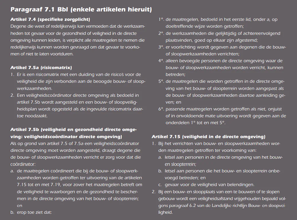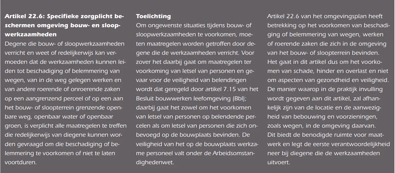 Een deel van de bouw- en sloopveiligheid komt via de bruidsschat in het omgevingsplan. Dit betreft de zogeheten specifieke zorgplicht voor het beschermen van de omgeving bouw -en sloopwerkzaamheden. Dit betreft artikel 22.6 van de bruidsschat (zie kadertekst). Uit de toelichting blijkt duidelijk dat dit dus alleen maar gaat over schade, hinder en overlast, en niet over aspecten van gezondheid en veiligheid. Het artikel staat in het omgevingsplan, maar is niet specifiek een omgevingsplanactiviteit. Er geldt daarmee ook geen vergunningplicht om deze maatregelen aan te tonen en geen beoordelingskader om er op te toetsen. Wil je als gemeente kunnen toetsen en beoordelen of er voldoende maatregelen worden getroffen, dan zal er op basis van dit artikel aanvullend beleid moeten worden vastgesteld; dan pas wordt een zorgplicht een regel. Dit beleid is er in de vorm van de Landelijke richtlijn bouw- en sloopveiligheid. Hierin zijn deze onderwerpen uitgewerkt en hierop kan een gemeente die dit beleid als onderdeel van het omgevingsplan vaststelt, toetsen en beoordelen. Als hier onvoldoende aan wordt voldaan moet er eventueel worden gehandhaafd.