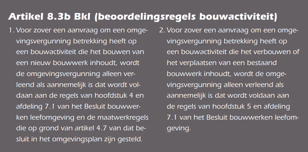 Artikel 8.3b geeft aan dat naast de technische aspecten van het Bbl een bouwactiviteit ook moet worden getoetst aan de voorschriften van afdeling 7.1 van het Bbl. Als deze daar niet aan voldoet, moet de vergunning worden geweigerd. Via de aanvraagvereisten voor de bouwactiviteit in de Omgevingsregeling wordt geregeld dat de gegevens en bescheiden voor de beoordeling van bouw- en sloopveiligheid aangeleverd worden bij de vergunningaanvraag. Wanneer een bouwactiviteit straks valt onder het stelsel van kwaliteitsborging moeten deze gegevens bij de melding worden aangeleverd. Dit wordt nog geregeld in het besluit kwaliteitsborging. Het niet voldoen aan de eisen uit afdeling 7.1 van het Bbl voor een bouwmelding betekent dan dat de melding wel is gedaan, maar niet mag worden uitgevoerd omdat niet wordt voldaan aan de regels. Bij de vergunning wordt het dus een weigeringsgrond en bij de melding een handhavingsgrond, omdat een melding nu eenmaal niet kan worden geweigerd. Wel kunnen na zowel de melding als de vergunning zo nodig maatwerkvoorschriften worden opgelegd aan de initiatiefnemer.